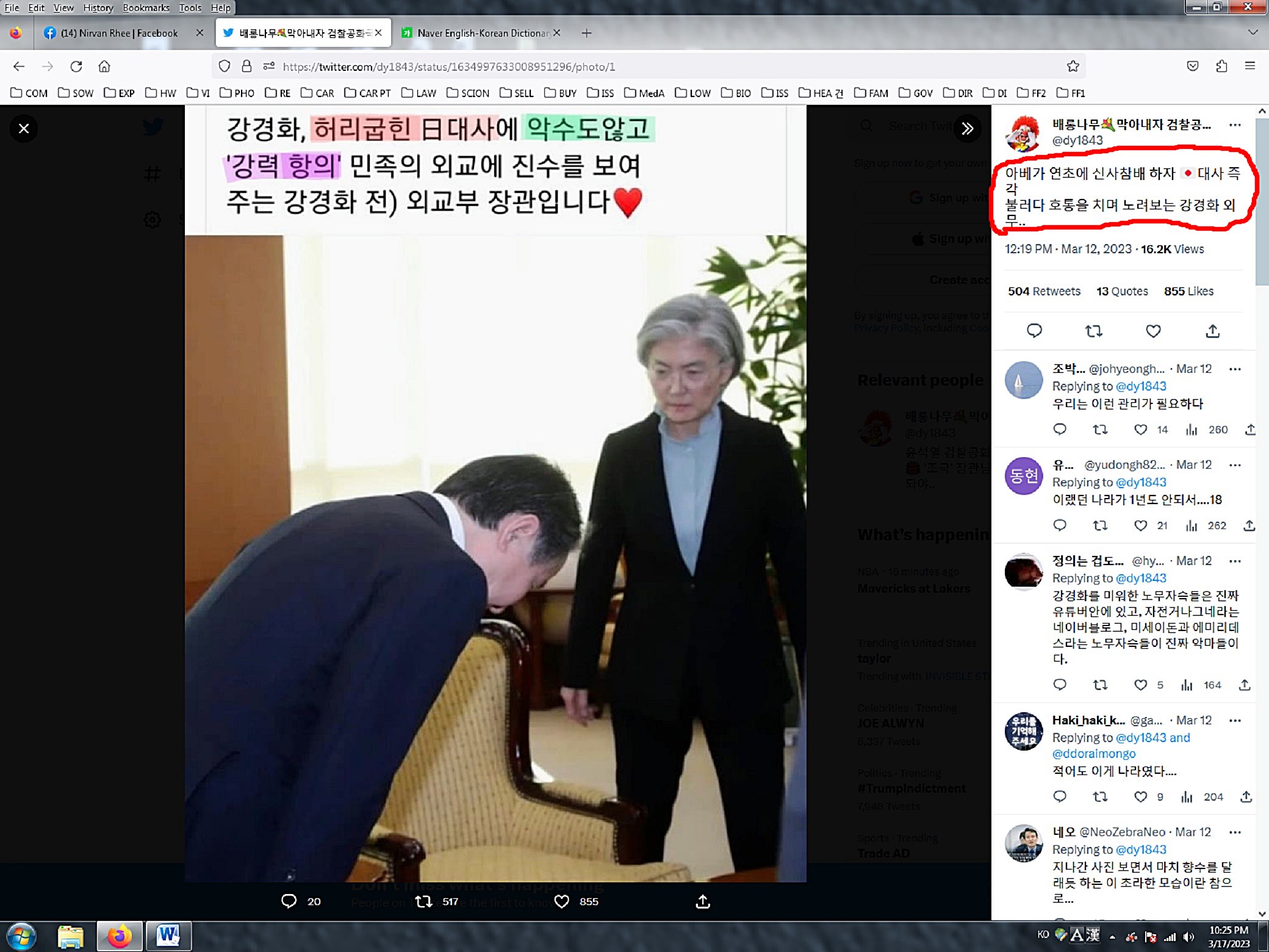 강경화 외교부 장관, 절규하며 노려보는 주일대사 사진, T298 2023년 03월 18일 by issue 쉬운 목차 Toggle 강경화 외교부 장관, 고함을 지르며 바라보는 일본 대사의 사진, 연초에 아베가 신사를 참배하게 하라즉시 일본대사 불러서 소리지르며 쳐다보기강경화 외교부 장관, 강경화 외교부 장관, 고함을 지르며 바라보는 일본 대사의 사진, 연초에 아베가 신사를 참배하게 하라 즉시 일본대사 불러서 소리지르며 쳐다보기 강경화 외교부 장관,