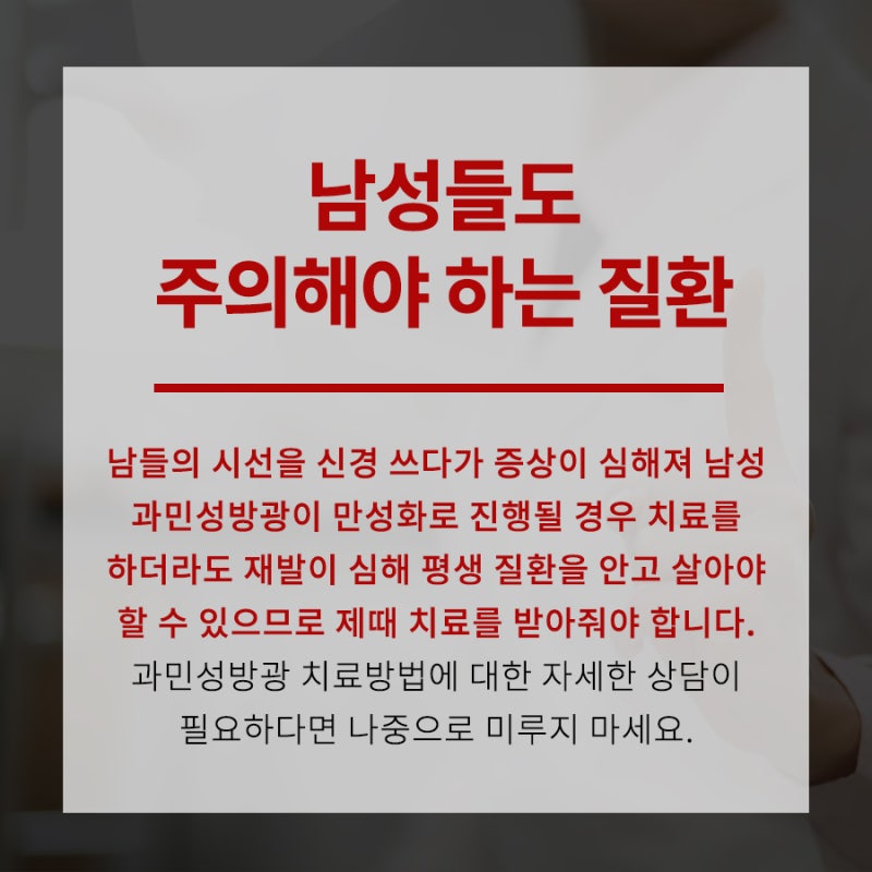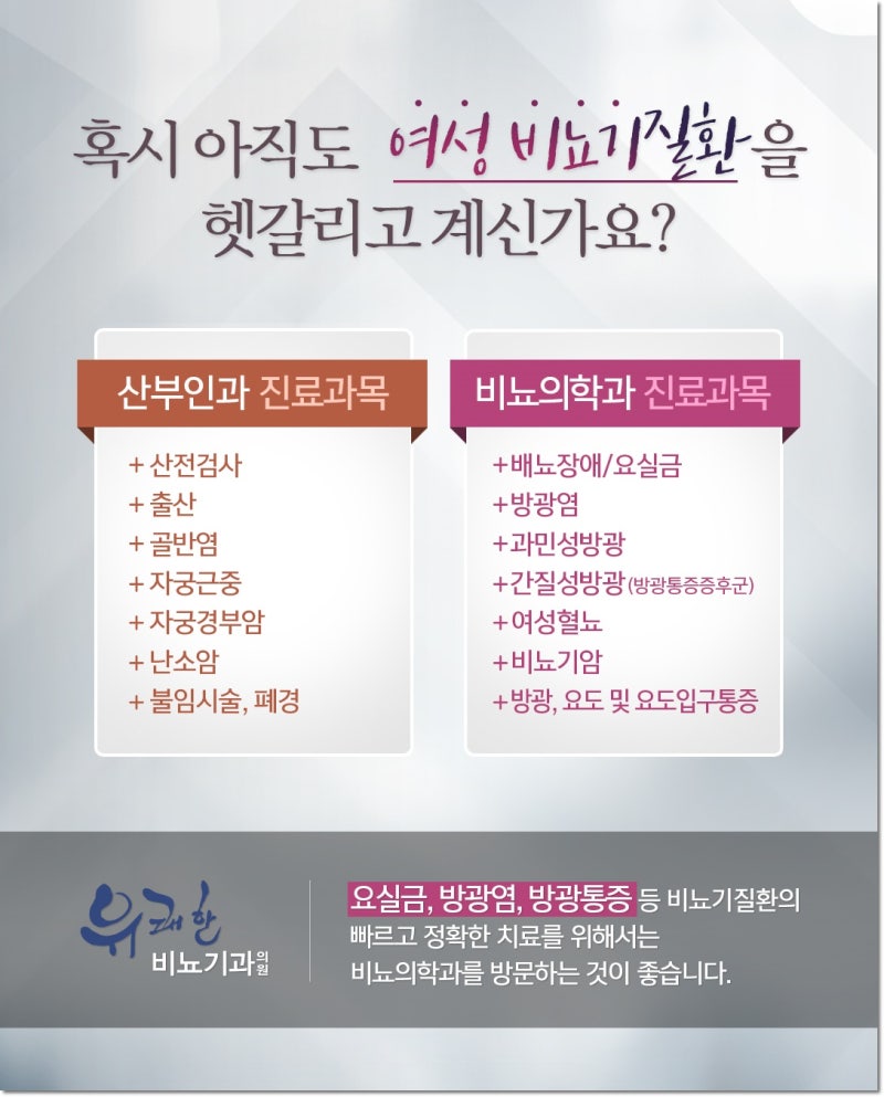 이렇게 과민성 방광염을 미루고 치료하지 않는 것은 옳지 않습니다. 해당 질환에 대한 조기 진단과 적절한 치료는 환자의 통증을 완화시키고 삶의 질을 빠르게 향상시킬 수 있으므로 만약 현재 과민성 방광염 증상이 의심되는 경우 조기 진단과 적절한 치료를 통해 통증을 완화시키고 삶의 질을 향상시키기 위해 노력해야 합니다.가까운 산부인과를 방문하여 확실한 치료 방법을 찾아 통증과 불쾌감을 덜어 보시기 바랍니다.