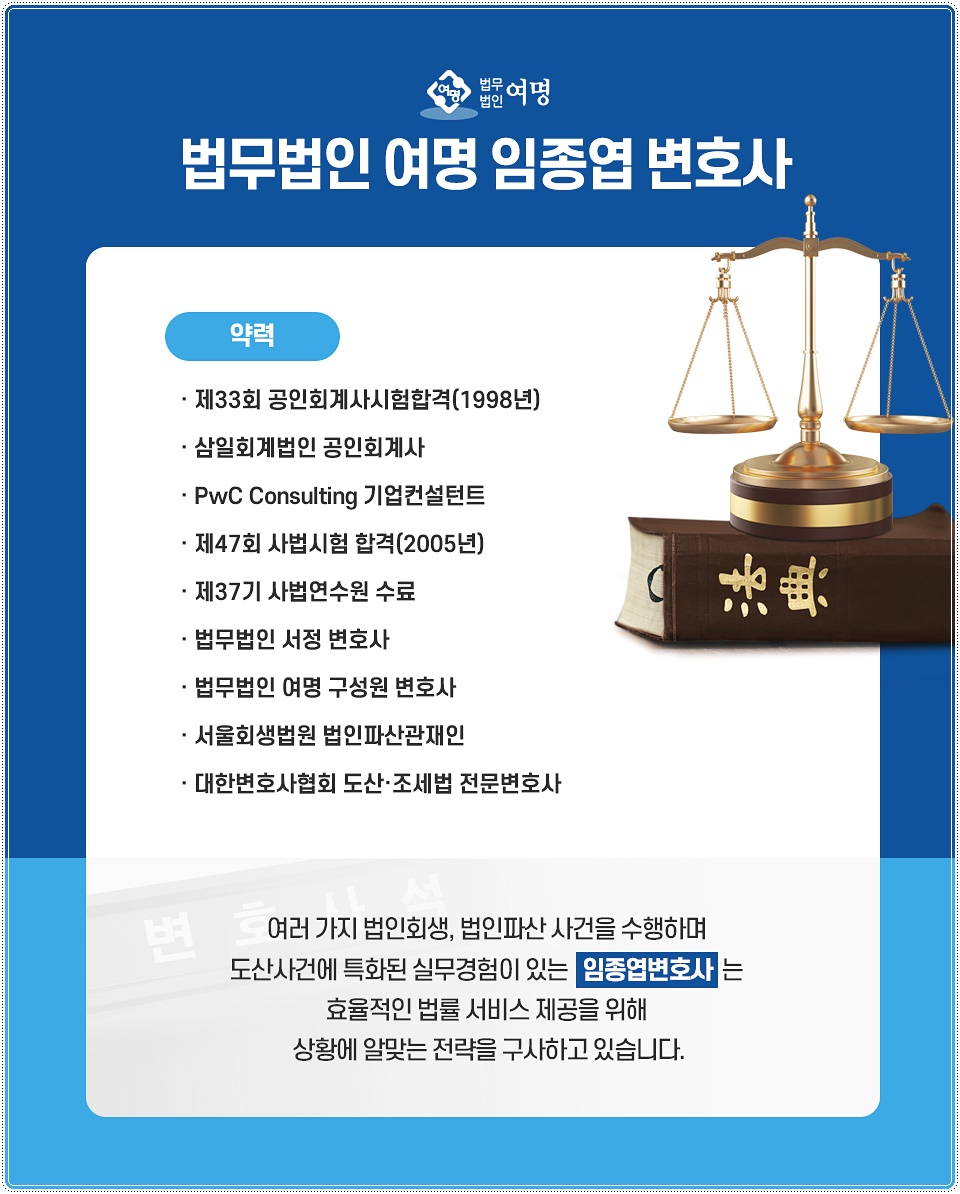 이때 파산 전문 변호사 임종엽의 도움을 받을 수 있다. 임종엽 변호사는 공인회계사로 서울회생법원 파산관재인으로 근무한 경력이 있습니다. 다양한 실무 경험을 바탕으로 에이전트의 상황에 맞는 맞춤형 대응을 구현합니다. 따라서 관련 문제가 있으면 주저하지 말고 상담하십시오.