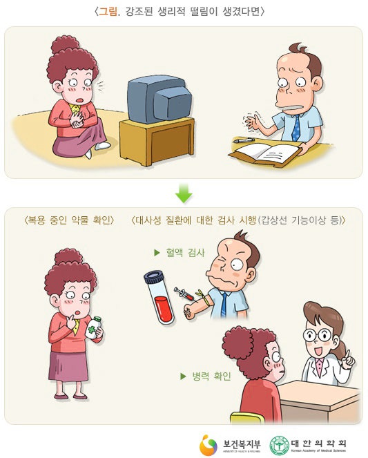 여러 원인으로 발생하는 법원원에는 여러 가지가 있지만 뇌손상이 원인이 되는 경우도 있어 가족력, 약물 복용 여부, 갑상선 질환 여부를 조사해 원인을 밝혀내는 것이 좋습니다. 이와 함께 피로, 긴장, 불안, 커피, 공복 등으로 인해 증상이 더욱 심해집니다. 그 외 파킨슨병이나 갑상선 기능 항진증, 약 복용 등으로 인한 증상이 나타날 수 있습니다. 특히 파킨슨병에 의한 손떨림은 동작을 멈추면 증상이 심해지는 것이 특징입니다.