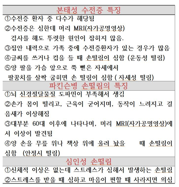 손떨림은 일상생활에 많은 불편을 가져다 줍니다. 이것은 생각보다 많은 사람들에게 폐를 끼칩니다. 손떨림은 자신의 의지와 상관없이 손떨림 증상으로 심할 경우 온몸이 떨려서 물건조차 빠지지 않는 경우도 있습니다. 누구나 한 번쯤 가벼운 이것을 경험했을 정도로 흔한 현상이지만 이를 방치하고 소홀히 하면 자칫 큰 병을 키울 수도 있습니다.