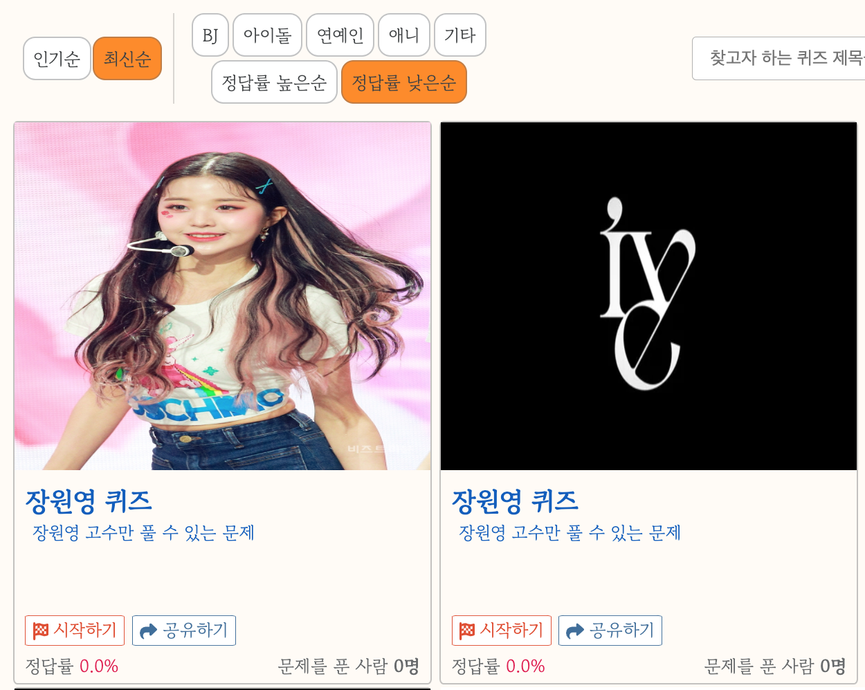 이름만 들어도 “아, 이 퀴즈가 장원영의 퀴즈구나”라고 생각할 수도 있겠지만, 직관적으로 클릭하고 싶은 퀴즈는 왼쪽에 있다. 퀴즈를 만들 때 사용자는 직관적이고 서비스 규칙을 위반하지 않으며 사람들의 관심을 끌 수 있는 썸네일을 사용하는 이점이 있습니다.