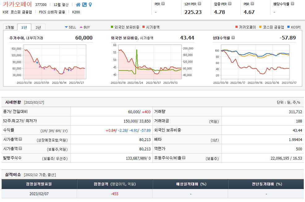 카카오페이 주가는 현재 6만원으로 전일 대비 -2.28원이다. 카카오페이의 주주현황을 보면 카카오(외 3개사)가 81.10%의 지분을 보유하고 있다. 카카오페이는 장중 주가가 6만원대인 소비자금융회사다. 삼성전자의 시가총액은 8조2130억원, 발행주식수는 43조4400억원이다. 외국인 참여는 311,712%, 일중 거래량은 133,687,989를 기록했다. 매출액은 3988억원, 영업이익은 -272억원이다. 주당순이익은 195원, 카카오페이 주식 배당수익률은 0.78%다.