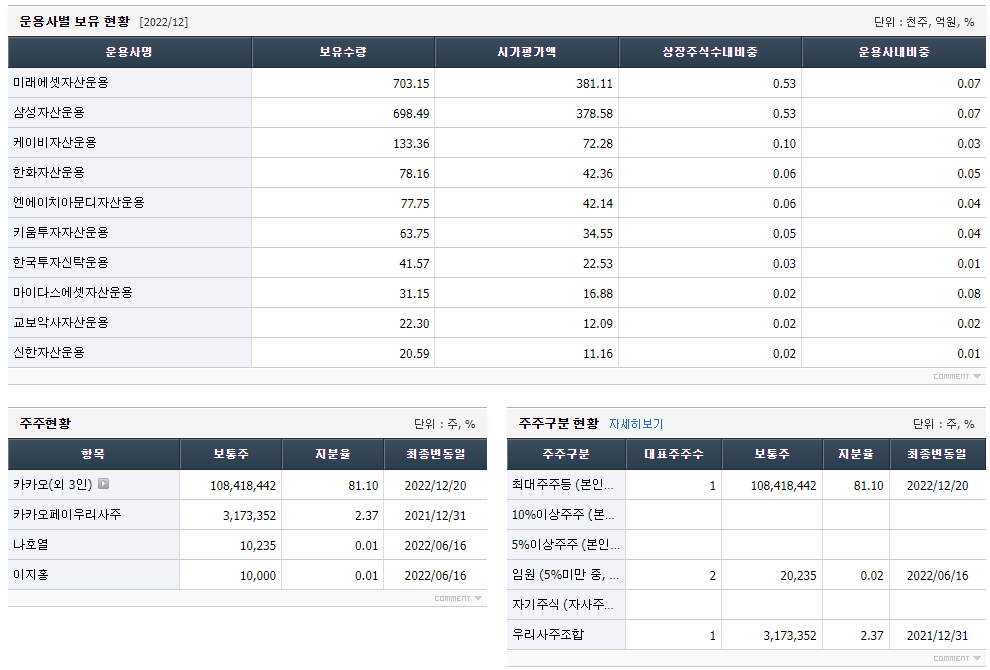 단기 투자 시에는 주주현황 정보가 필요하지 않으나, 장기적으로는 현 기업의 가치를 발굴하고 분석할 때 CEO의 경영철학과 능력도 함께 고려해야 합니다. 대주주들과 바로 이야기할 수는 없지만 그들이 어떻게 구성되어 있는지 살펴보는 것이 좋습니다.