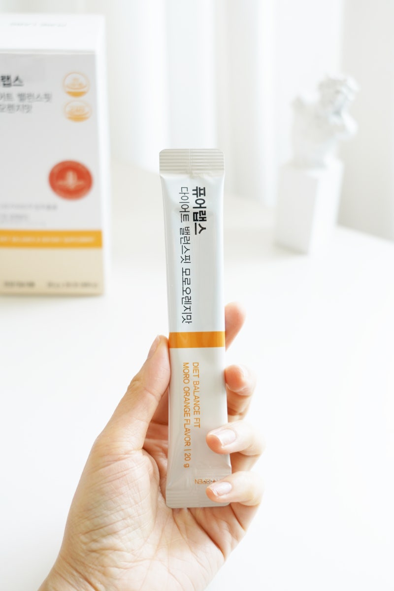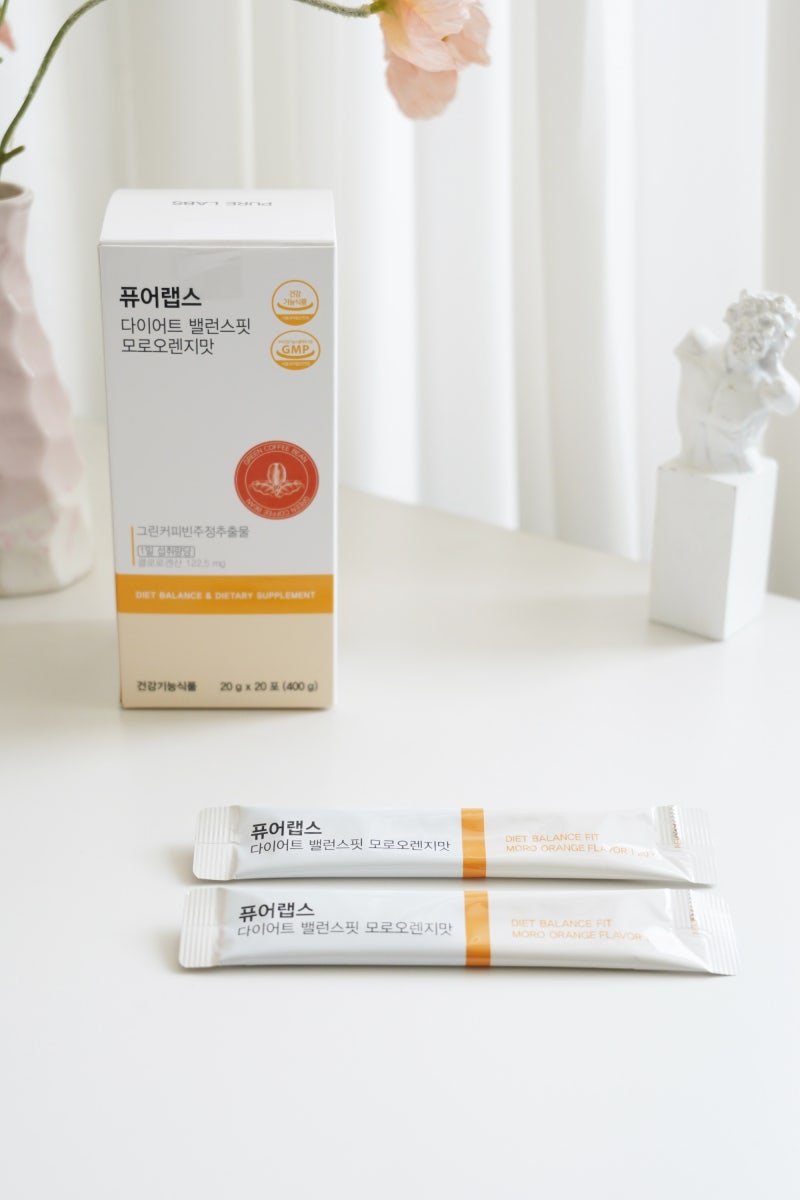 퓨어랩스 밸런스핏 모로오렌지 묵직한 싱글박스 외관부터 확연히 느껴지네요. GMP 인증업체에서 생산한 포인트도 눈에 잘 띄고 깔끔해서 안심하고 드실 수 있습니다.
