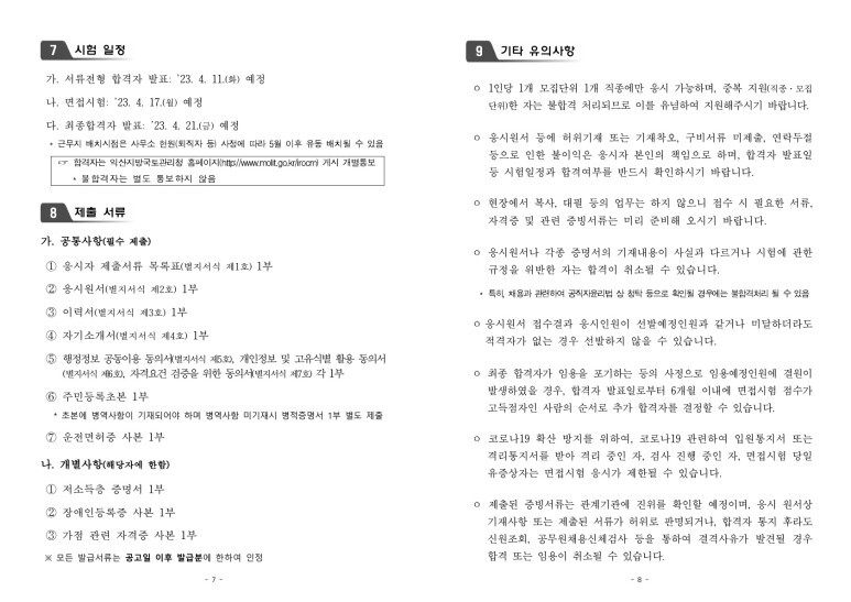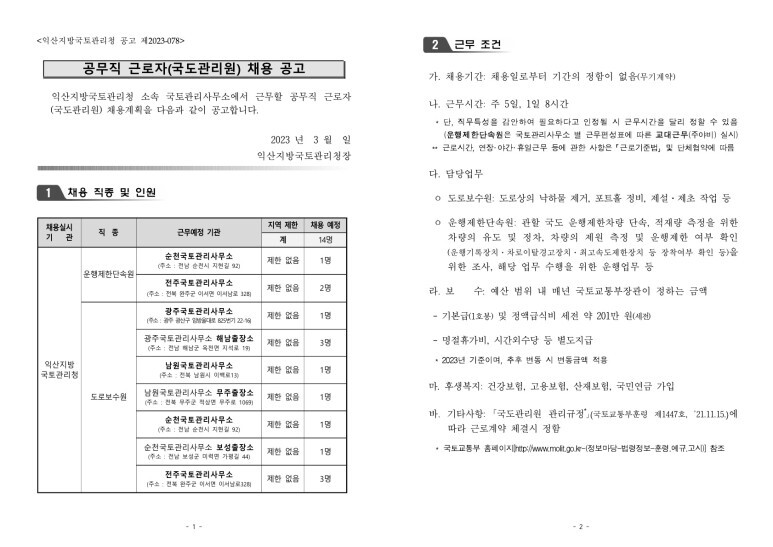 익산지방국토관리청 토지관리청에서 근무할 국도관리사 채용계획을 별첨과 같이 공고합니다.