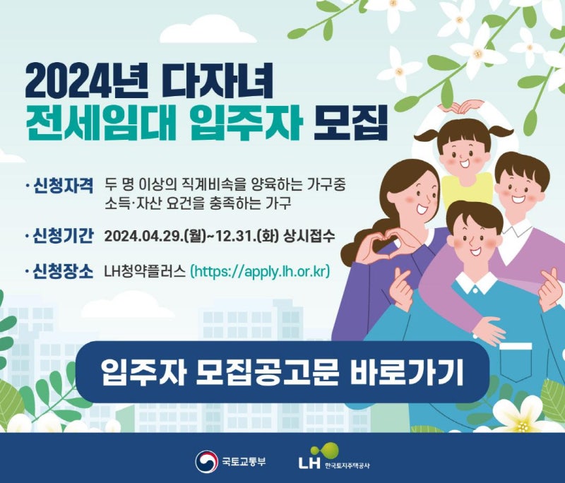 낮은 생년월일 부동산 조치의 일환으로,이 시스템은 최근 새로 결혼 한 부부와 생활을 포함하여 처음으로 출산 가구의 기회를 확대함으로써 주택 비용의 부담을 줄이기 위해 처음으로 지속적으로 개정되었습니다. LH 어린이 신청 신청을 신청하는 경우, 당사는 자격 요건으로 세입자를 모집하고 있습니다. 나는 당신이 당신을 원하는 사람들에게 많은 도움을 주시기를 바랍니다.